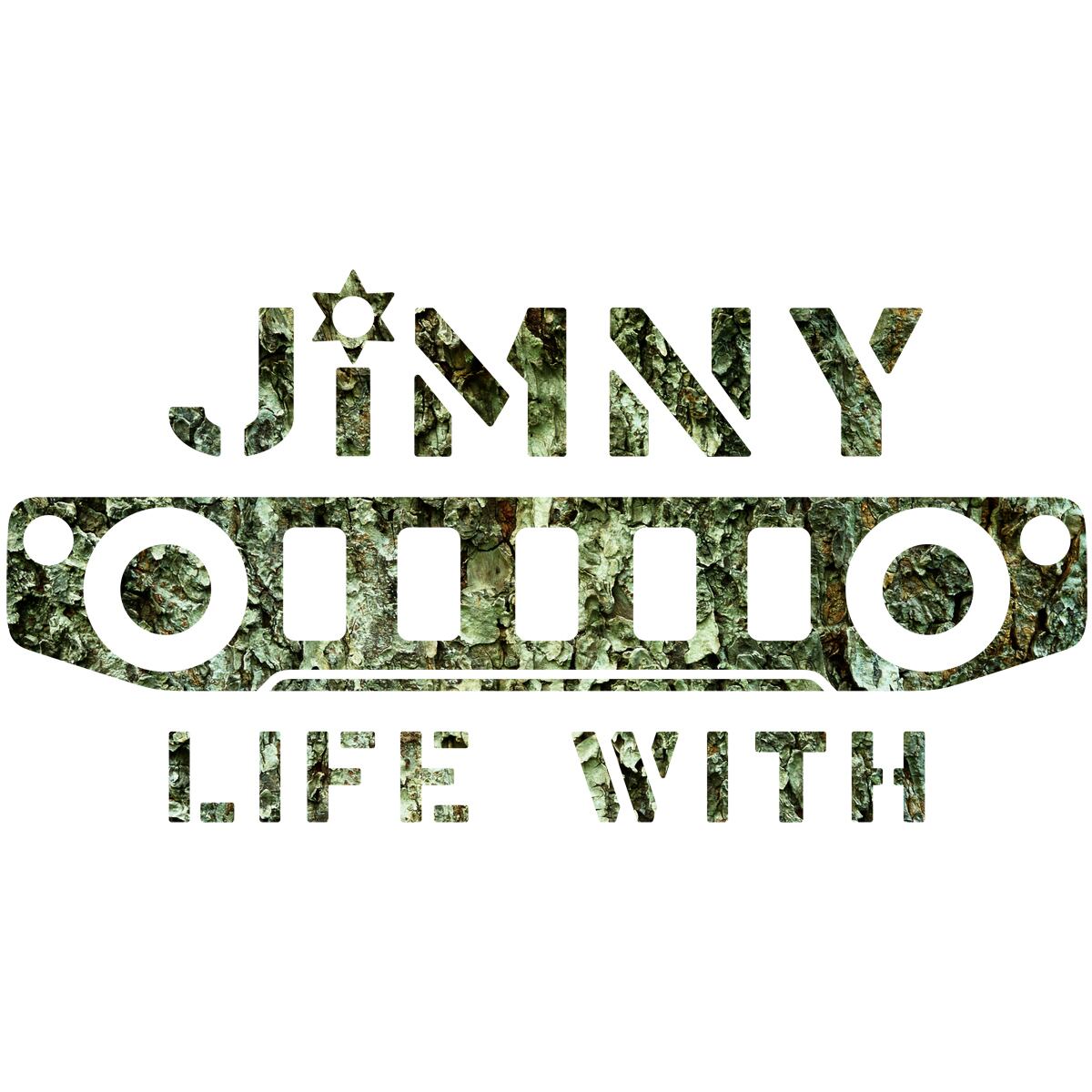◎無骨なジムニーのロゴを木の樹皮の模様で装飾し、アウトドアなイメージを引き立てたデザイン。